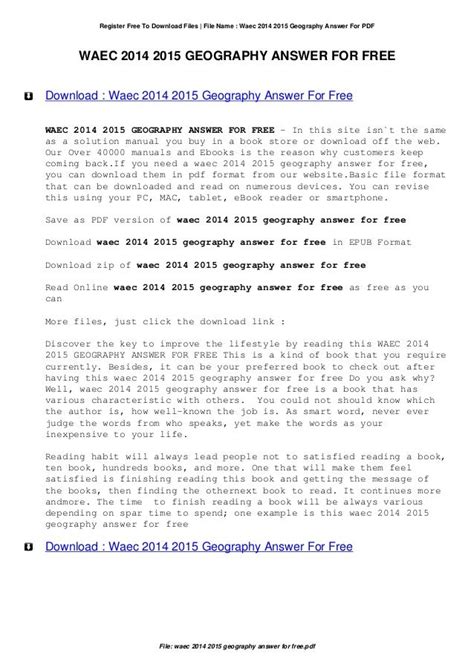 Download Waec Answers To Geograhy Practical 2014 Reader online is a convenient and frugal way to read Waec Answers To Geograhy Practical 2014 you love right from the comfort of your own home. Yes, there sites where you can get Reader "for free" but the ones listed below are clean from viruses and completely legal to use.